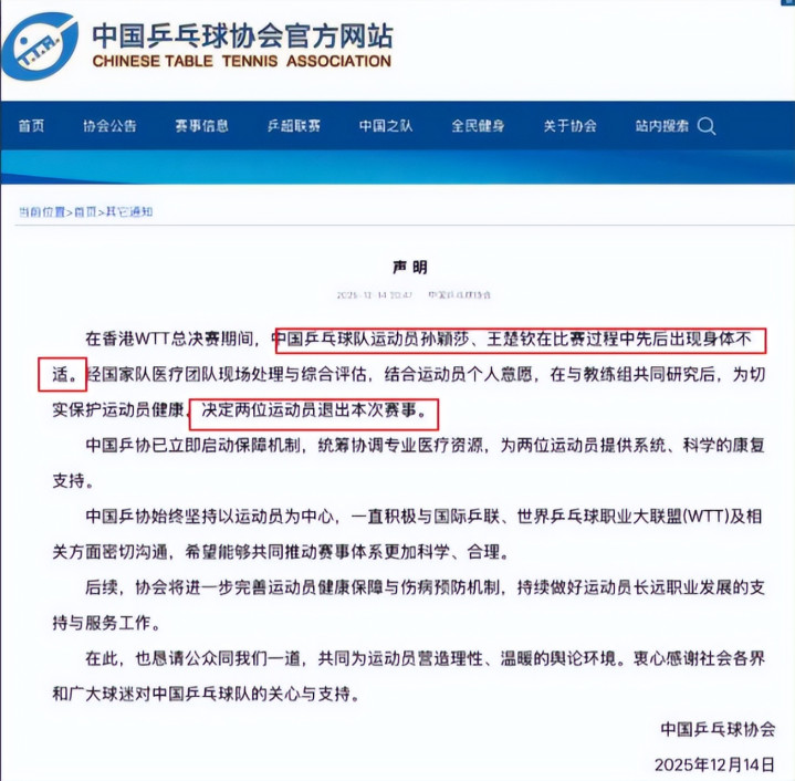 最终,在2025年终总决赛的半决赛上,那根紧绷的弦如故断了——孙颖莎和王楚钦,这对国乒的中枢组合,接连因伤退赛。