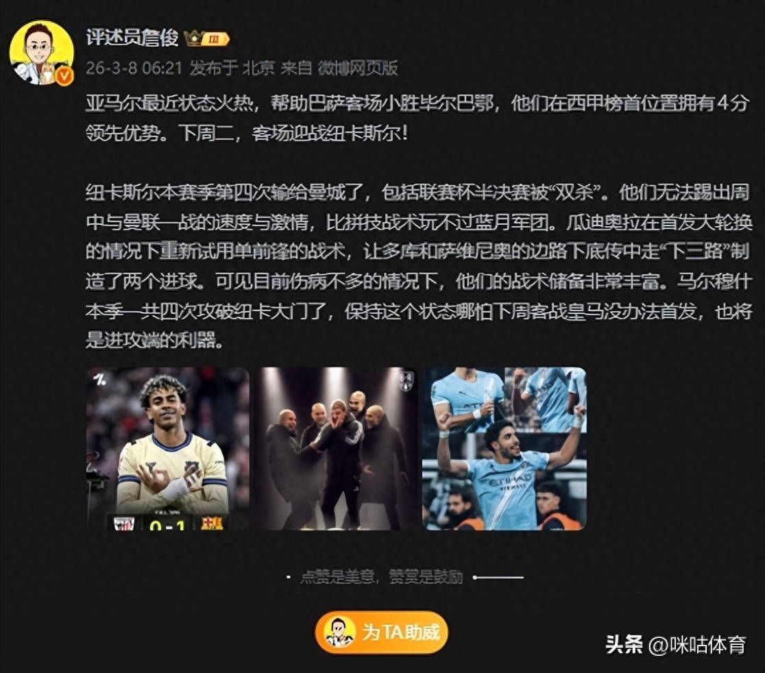 发布日期:2026-03-10 03:11 点击次数:185足总杯曼城客场3-1投诚纽卡斯尔联,西甲巴塞罗那客场1-0小胜毕巴,驰名挑剔员詹俊先生在社媒作念出点评。